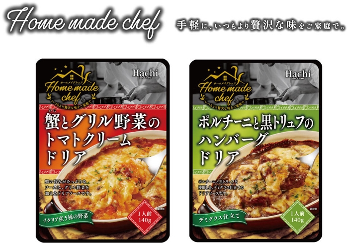 ハチ食品株式会社(大阪府大阪市、代表取締役社長:高橋 慎一)は、手軽に、いつもより贅沢な味をご家庭で楽しんでいただけるシリーズ『Home made chef(ホームメイドシェフ)』の商品として、「蟹とグリル野菜のトマトクリームドリア」、「ポルチーニと黒トリュフのハンバーグドリア」の2品を2023年9月1日(金)に発売いたします。