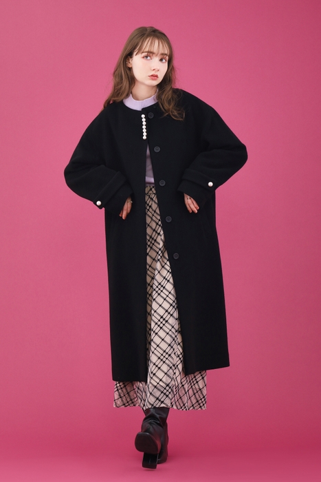 通勤スタイルにも使えるノーカラーコートはファー切替でお上品な印象になります。