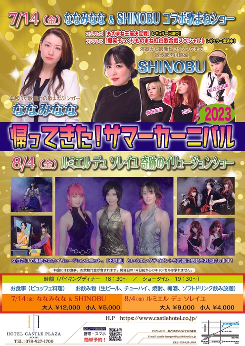 株式会社キャッスルホテル(本社:兵庫県明石市松の内2‐2、社長:成田良伸)は3年ぶりにサマーカーニバルを復活させ、系列の西明石ホテルキャッスルプラザ(所在地:同)で2日間にわたって開催いたします。7月14日(金)はTVで人気のものまねタレントさんによるショー、8月4日(金)は女性だけで構成された奇跡のイリュージョンショー。両日ともビュッフェ形式によるバイキングディナーをご用意しており、大人からお子さままで幅広い世代にお越しいただき、ホテルならではのショータイムを満喫してください。
