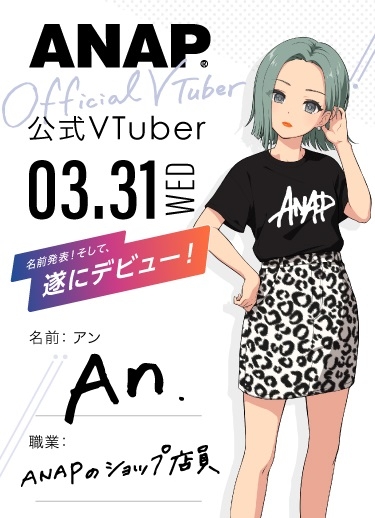 株式会社ANAP(本社:東京都港区、代表取締役社長:家髙 利康)の運営するブランド「ANAP」から、ANAP公式VTuberとして「An(アン)」がデビューすることとなりました。