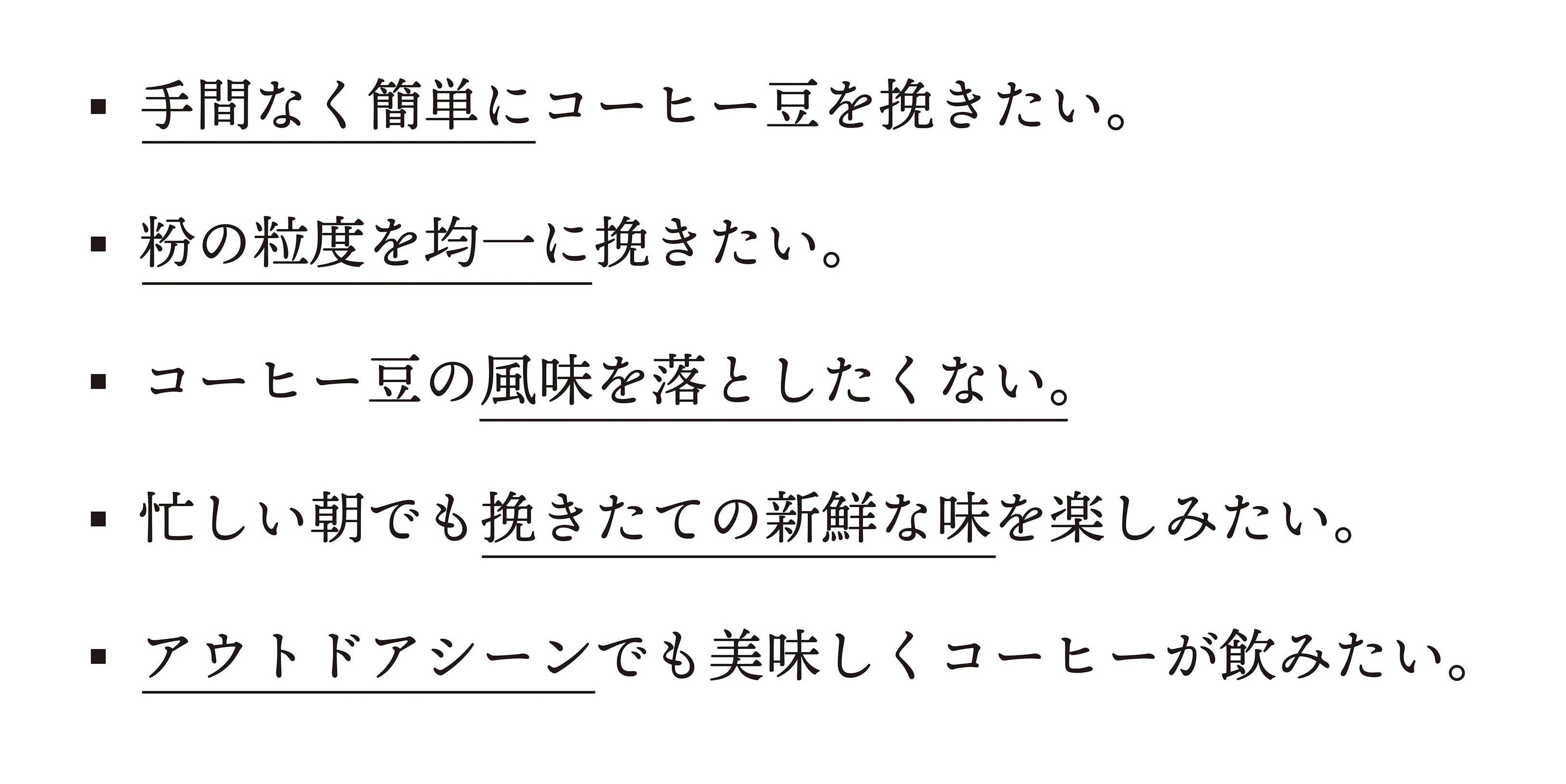 いつかは自分たちが出合ったコーヒーとの出会いを商品化したいと考えていました。楽しかったキャンプの夜に翌朝、静けさの中で飲むインスタントコーヒーに舌鼓を打ってきましたが、ある日友人が作ってくれた挽きたてコーヒーのコク深さに驚きました。その出会いは、きっと自分だけでは至らなかっただろうと、その出会いをより多くの人に体験してもらいたく、使用感や価格にもこだわりました。