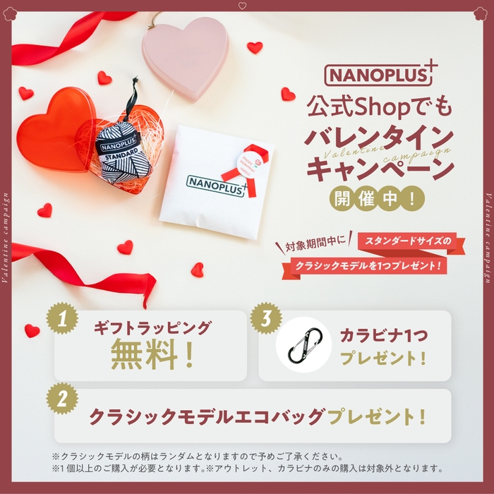 また、同期間にバレンタインシーズンにあわせてラッピングを施した手のひらサイズのエコバック「NANOPLUS」があたるInstagramキャンペーンも開催します。