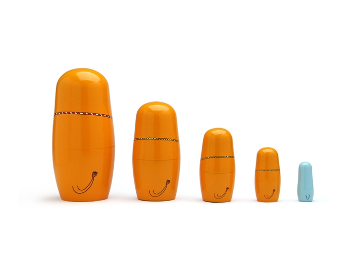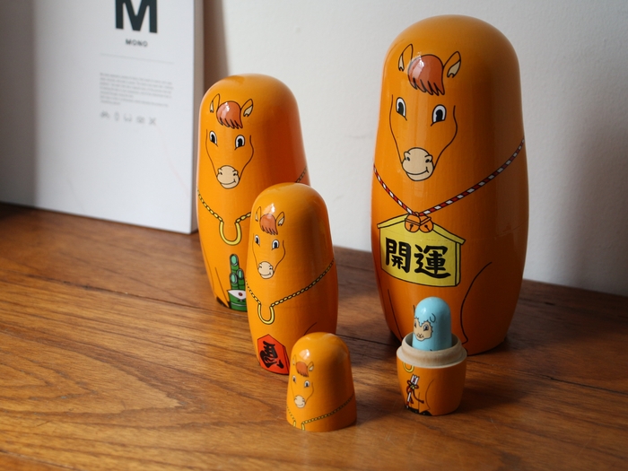 「ハッピーニューホース」は、大小5体の馬を入れ子式に収納できるマトリョーシカ。それぞれが縁起物を手にし、ひとつひとつに新年への願いを込めました。