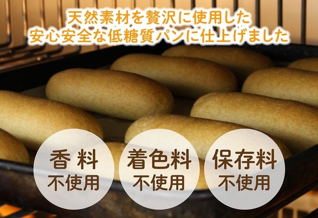 「低糖質ふすま粉パン」は独自の製造技術により、パンのおいしさを保ちながら糖質88%オフと糖類ゼロを実現。その糖質量はたったの2.7g。絹ごし豆腐1/2丁と同等の糖質量まで抑えました。普段食べているパンをこの「低糖質ふすま粉パン」に置きかえるだけで、簡単に糖質オフ。肥満ホルモンを正常化させてダイエットをサポートします。また、主原料には熊本県産小麦ふすま粉をつかい、大分県日田市の強炭酸水で“もっちりふんわり食感”に焼き上げ、食物繊維もたっぷりで栄養バランスも抜群。香料や着色料、保存料など合成添加物は一切つかわず天然素材を贅沢に使用しているので、安心しておいしく召し上がっていただけます。