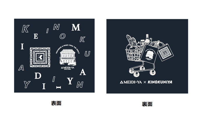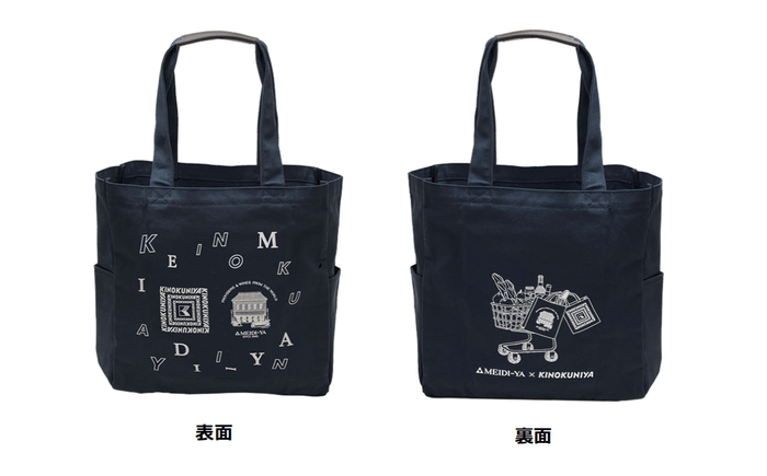 明治屋創業140周年、紀ノ国屋創業115周年を記念した初めてのコラボレーションバッグ。表はそれぞれのロゴとアルファベットを散りばめ、裏は明治屋・紀ノ国屋どちらの店舗でもお買い物を楽しんでいただきたい、という想いを込めたデザインとなっております。