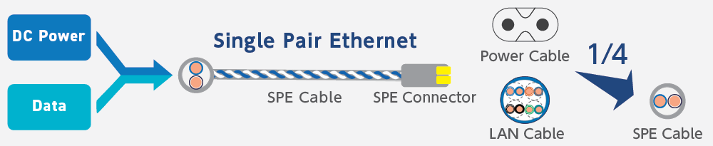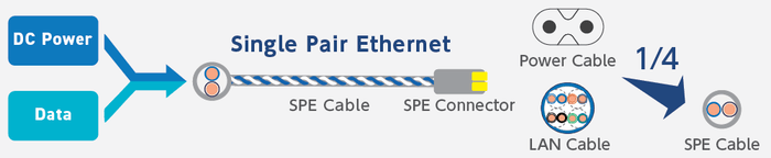 *1:SPEは、IEEEで規格化された技術で自動車向けに使用されており、2030年までに産機や家庭用など既存のアプリケーション向けにも拡大が期待されています。SPEでは1ペアのケーブルでEthernet通信とDC給電を同時に実施でき、さらにケーブル材の使用量を約1/4まで削減することも可能です。