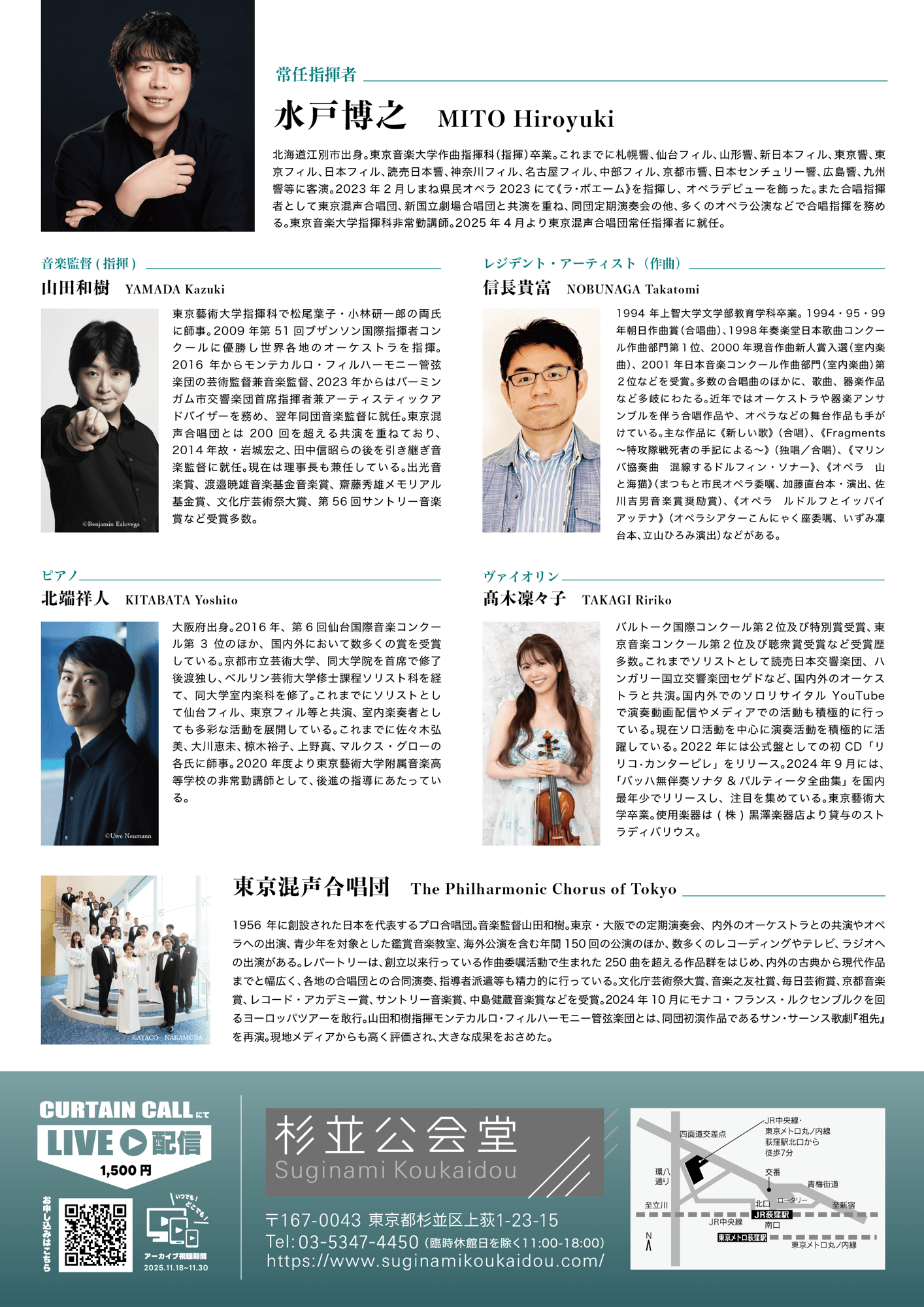 一般財団法人合唱音楽振興会主催、「水戸博之 常任指揮者 就任披露『東京混声合唱団第268回定期演奏会』」が2025年11月16日 (日)に杉並公会堂 大ホール(東京都杉並区上荻1-23-15)にて開催されます。 チケットはカンフェティ(運営:ロングランプランニング株式会社、東京都新宿区、代表取締役:榑松 大剛)にて発売中です。