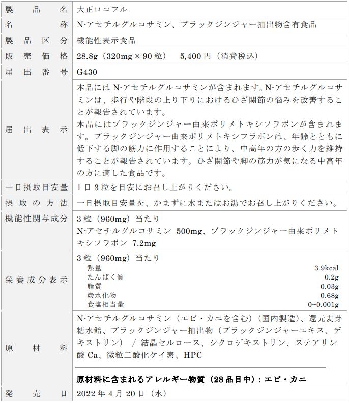 「大正ロコフル」は、機能性関与成分として一日摂取目安量3粒中、N-アセチルグルコサミンを500mg、ブラックジンジャー由来ポリメトキシフラボンを7.2mg配合しています。