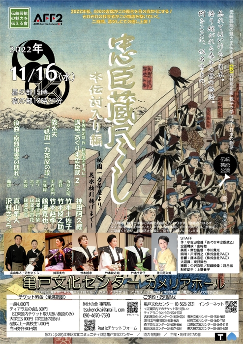 附けの會(代表:山崎徹)主催、伝統芸能の魅力を伝える會2022produce『忠臣蔵尽くし 本伝討入り編』が2022年11月16日 (水)に亀戸文化センター(カメリアホール)(東京都江東区亀戸2-19-1カメリアプラザ5F)にて上演されます。