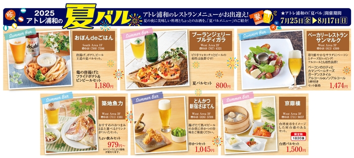下記期間中、アトレ浦和レストランショップでお得にちょい飲みセットを楽しむことができる「夏バル」を展開します。おひとりでもグループでも気軽に楽しめる限定メニューとなっております。