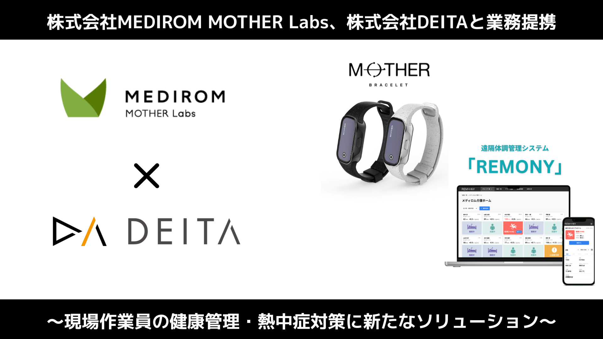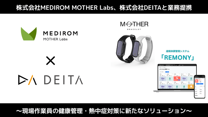 今回の提携により、セールステック事業を展開するDEITAが、マザーラボが開発する充電不要のスマートトラッカー「MOTHER Bracelet®︎」を活用した、遠隔体調管理システム「REMONY」の販売業務を受託し、営業活動を行ってまいります。これにより、製造業や建設業を中心に、現場作業員の健康管理や熱中症対策を目的とした導入を推進してまいります。