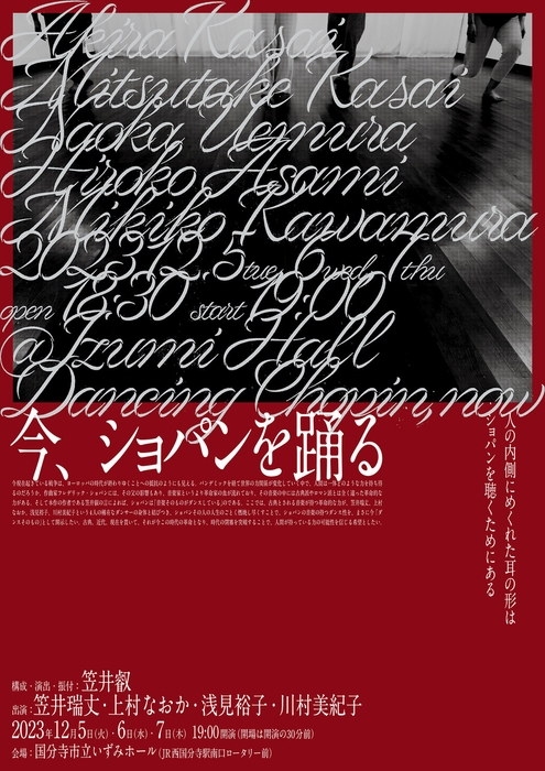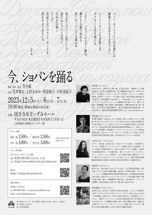 笠井瑞丈×上村なおか主催、『今、ショパンを踊る』が2023年12月5日 (火) ~2023年12月7日 (木)に国分寺市立いずみホール(東京都国分寺市泉町3-36-12)にて上演されます。