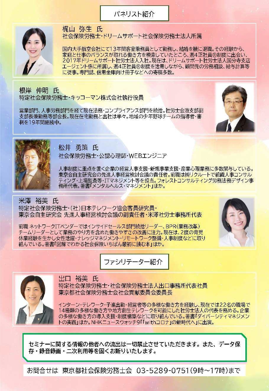 そこで、『コロナ後の人が集まる企業の働き方』として、テレワーク、短時間正社員、兼業・副業など従来とは違う新しい働き方をテーマに、最近多い事例、成功例・失敗例等を交えながら、導入のポイントや注意点について、4名の社会保険労務士が解説します。