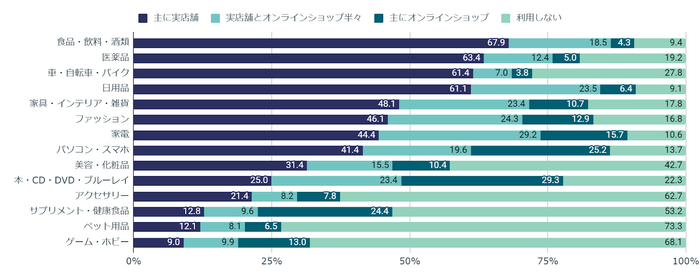 50代以上のECナビユーザーのショッピングは、食品・医薬品・日用品・車関連などは実店舗利用が多く、パソコン・スマホ、本・CD・DVD、サプリメント・健康食品はオンライン比率が高い傾向にあります。食品・医薬品・日用品・車関連などの訴求に関してはネットでの情報提供から実店舗への誘導、また、パソコン・スマホ、本・CD・DVD、サプリメント・健康食品の訴求は、直接オンライン施策の効果が期待できます。
