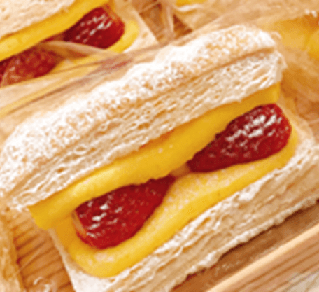 サクサク食べごたえ抜群なミルフィーユの生地にたっぷりとオリジナルカスタードをしぼり、さらに甘酸っぱい苺をサンドしました。