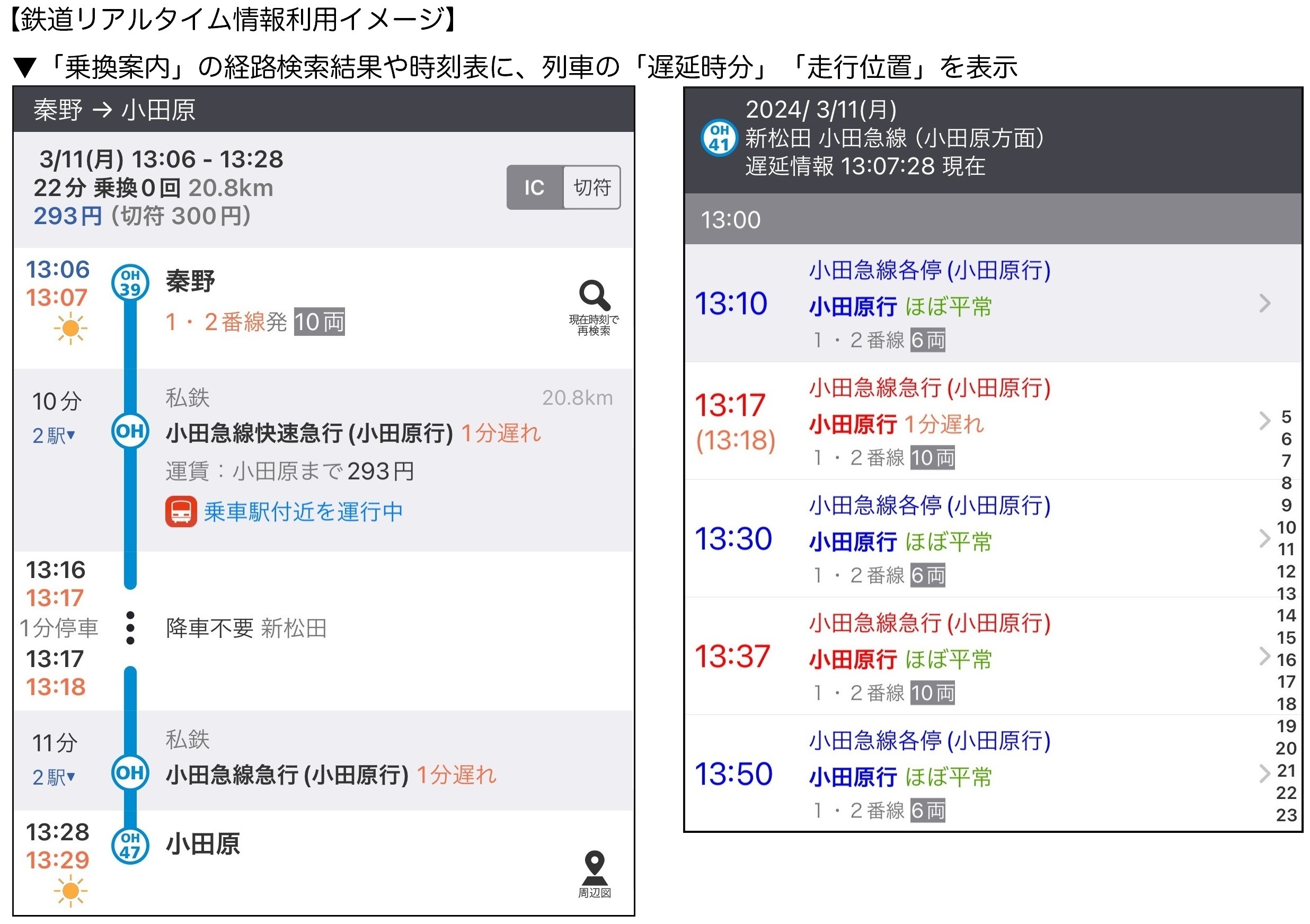 リアルタイムデータとの連携では、「乗換案内」で小田急電鉄各線を含む経路を検索した際に、現在運行中の列車の「遅延時分」、および「走行中の列車位置」を検索結果画面に表示します。また、前後列車一覧画面や、時刻表画面でも、各列車の最新の運行状況を表示します。