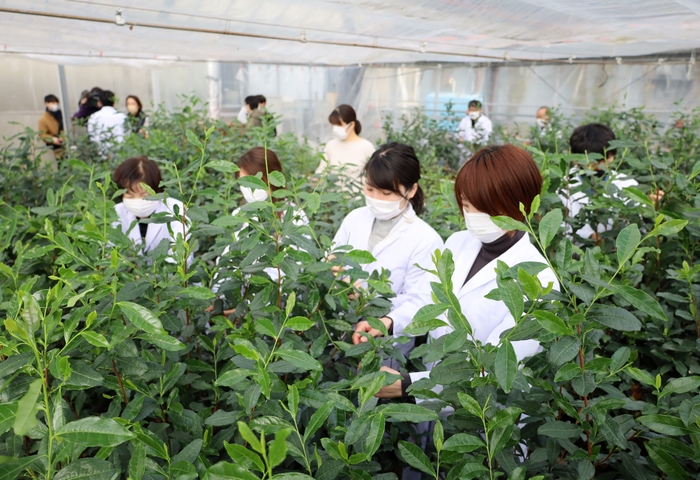 この研究成果の披露として、2023年1月5日に日本一早い新茶の初摘みを行い、摘んだお茶の葉は、茶の開祖 栄西禅師の像にお供えし、本年の茶業発展を祈願いたしました。