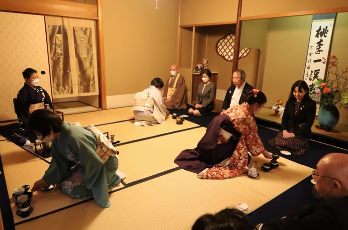 その後、ご来賓の皆様をお招きして、茶室「華松庵」にて手もみ茶の初茶会を開催、出来あがった初手もみ宇治茶を味わっていただきました。