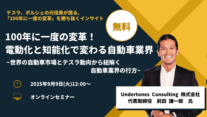 本セミナーでは、テスラモーターズ(現テスラ)、ポルシェジャパンでそれぞれマーケティングの要職を歴任した 前田 謙一郎 氏が登壇。テスラが牽引するAI・ロボティクス戦略の真相や、世界の電動化のリアルな動向など、メーカー内部からの視点とグローバルな知見を基に、自動車業界の未来と変革期を勝ち抜くためのヒントを紐解きます。