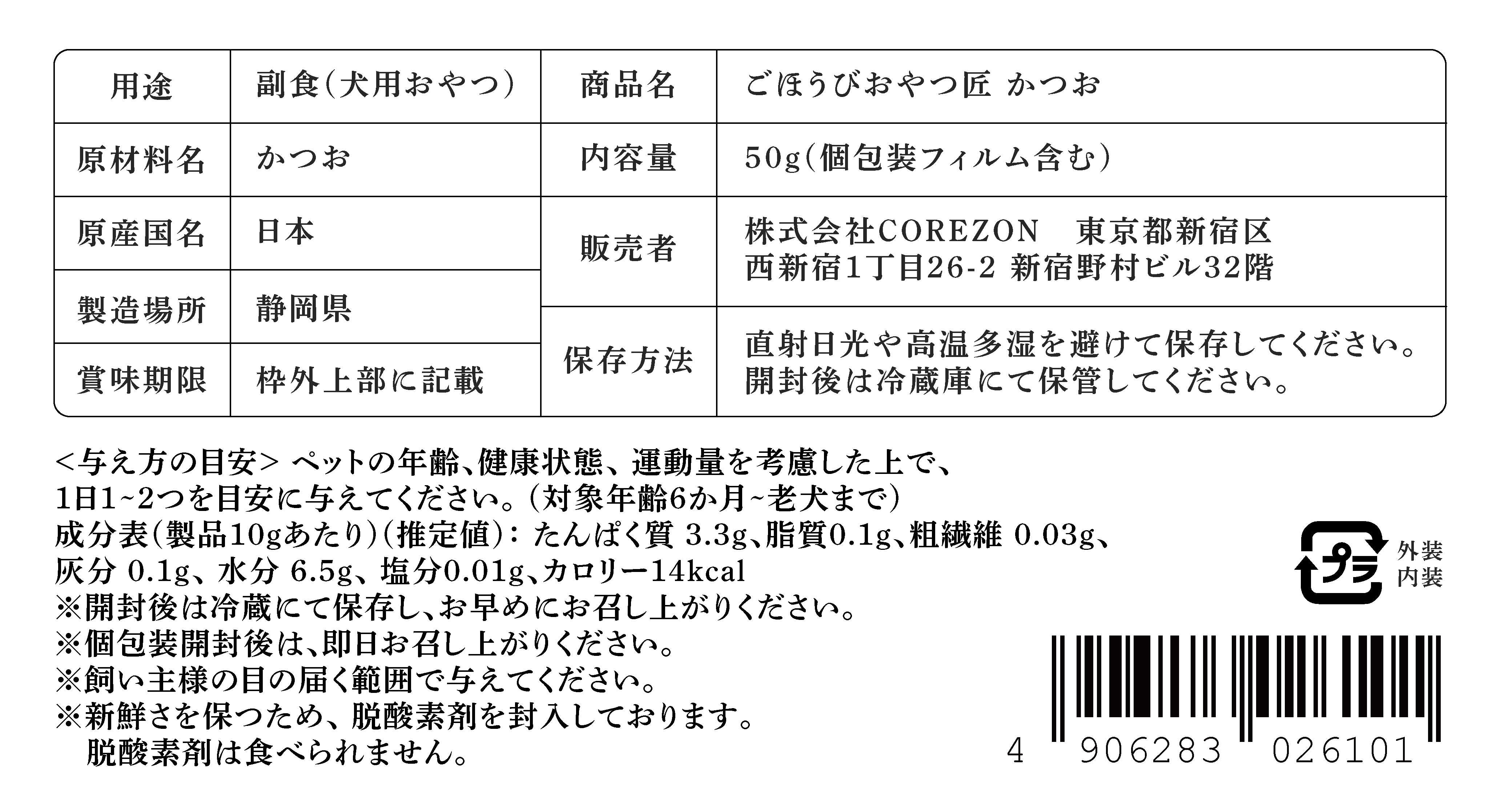 株式会社COREZON(本社:東京都新宿区西新宿1-26-2 新宿野村ビル32F、代表取締役:久保 退三)は、ペットとのふれあいを通じて人とペットの健康寿命を延ばし、笑顔あふれる社会を目指しています。このたび、焼津産の新鮮な海の幸を使用した新商品『ごほうびおやつ匠 かつお』『ごほうびおやつ匠 まぐろ』を、2025年4月1日より発売します。