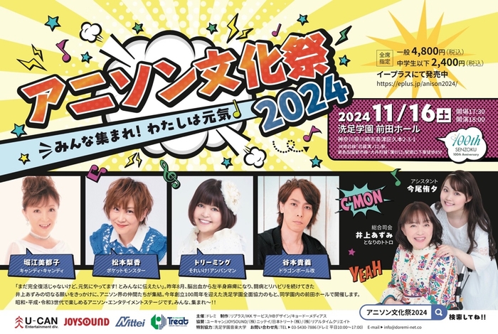 昨年8月、自身の40周年記念公演の当日リハーサル中に脳出血で緊急手術を受け左半身麻痺と闘いながらリハビリ生活を続けてきた井上あずみの復帰を祝い、アニソン歌手仲間が集結。今年創立100周年を迎えた洗足学園の協力のもと、同学園内の前田ホールで開催します。レジェンドアニソン歌手と洗足学園音楽大学生のコラボも見どころです。