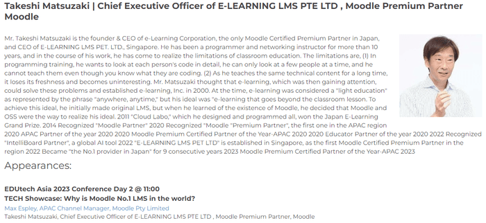 日本で唯一のMoodle公式プレミアムパートナーである株式会社イーラーニングのCEOとして、そして東南アジア初のMoodle公式プレミアムパートナーであるE-LEARNING LMS PTE. LTD.のCEOとして、Moodleを東南アジア地域に広めるために、これからも尽力して参ります。