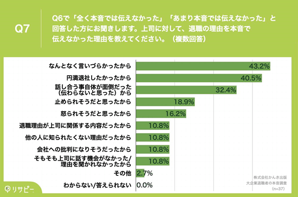 Q6で「全く本音では伝えなかった」「あまり本音では伝えなかった」と回答した方に、「Q7.上司に対して、退職の理由を本音で伝えなかった理由を教えてください。(複数回答)」(n=37)と質問したところ、「なんとなく言いづらかったから」が43.2%、「円満退社したかったから」が40.5%、「話し合う事自体が面倒だった(伝わらないと思った)から」が32.4%という回答となりました。