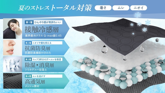 表面には、触れた瞬間にひんやり感が広がる冷感素材を使用。寝返りのたびに冷たさを感じられ、夏の寝苦しさをやわらげます。中材には、シリカゲルと珪藻土を組み合わせた除湿シートを内蔵。寝汗や湿気をしっかり吸収し、ジメジメ感や気になるニオイの発生を抑えます。さらに、抗菌防臭わたと通気性の高いメッシュ層を重ね、ムレや寝汗による不快感をトータルでケアします。