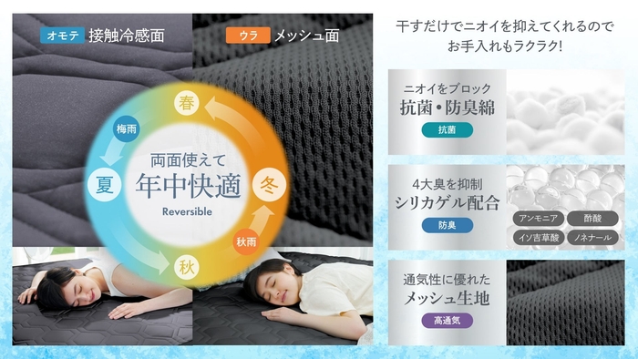 そんな想いから、“冷感+除湿”で夏の寝苦しさをまるごとケアする敷きパッド・枕パッドを開発しました。内蔵されたシリカゲル×珪藻土の除湿シートにより、4層構造で冷感・除湿・通気・抗菌をバランスよく実現。さらにリバーシブル仕様で、“夏だけ”で終わらない、1年中頼れる1枚が完成しました。