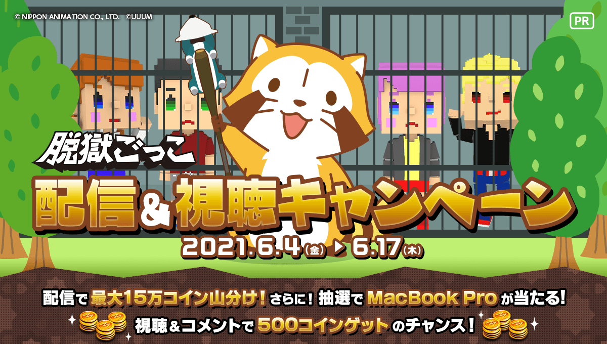 2021年6月4日(金)から6月17日(木)の期間、『脱獄ごっこ』をゲーム配信アプリ「Mirrativ(ミラティブ)」で配信された方には、達成配信数に応じてミラティブコイン最大15万枚が山分けされます。また、『脱獄ごっこ』の配信にて視聴&コメントされた方には、抽選でコイン500枚がプレゼントされます。またダブルチャンスとして、抽選で1名さまに「Mac Book Pro」をプレゼントいたします。