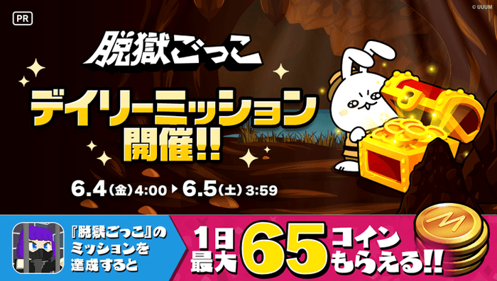 さらに2021年6月4日(金)から6月5日(土)、6月12日(土)から6月13日(日)の期間、『脱獄ごっこ』に関するミッションを達成すると達成内容に応じて毎日1日最大65コインがもらえる「デイリーミッション」を開催いたします。