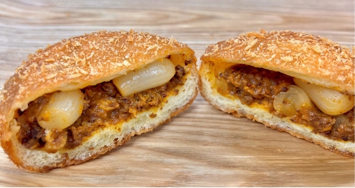 ごろごろらっきょうとピリッと辛いキーマカレーパン。さっぱりした辛さと酸味を楽しんでください。