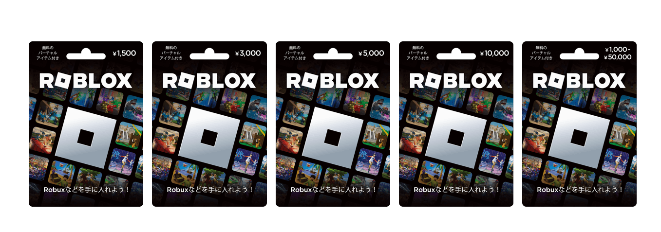 ギフトカードは5種類(1,500円、3,000円、5,000円、10,000円、1,000~50,000円)あり、日本で購入したすべての「Robloxギフトカード」には、月ごとに変わるバーチャルアイテムが特典として付いてきます。