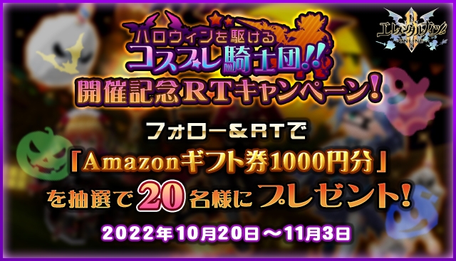 エレメンタルナイツオンラインRの公式Twitterアカウントをフォローして、期間中の対象ツイートをリツイートしてくれた方の中から、Amazonギフト券1000円分を抽選で20名様にプレゼント!