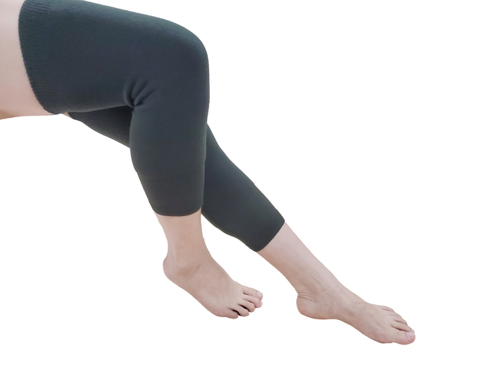 絶対条件としてはきつくないが緩くもないという部分を試作を重ねてたどり着いたのが、部分編み分け技法です。全体を締め付けると窮屈に感じてしまうので、パイル編みを編み分けることで少しだけ締め付け感がアップし足首部分にフィットするようになりました。その結果太もも部分は伸びて、足首部分は生地が余らないあったかサポーターを製品化することができました。