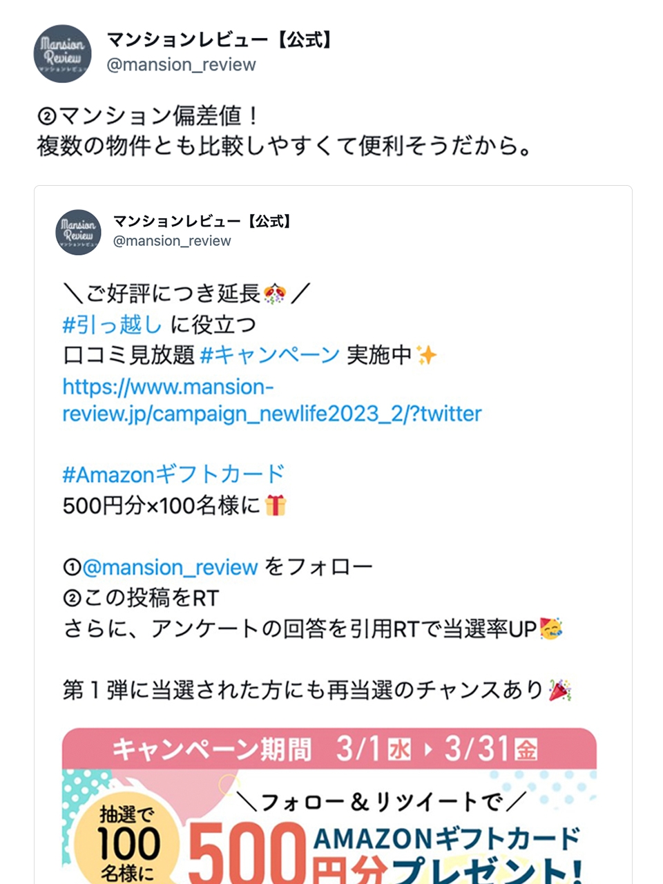 ②マンションレビュー公式TwitterのキャンペーンツイートをRT、または引用RTで、Amazonギフトカード500円分を抽選で100名様にプレゼント