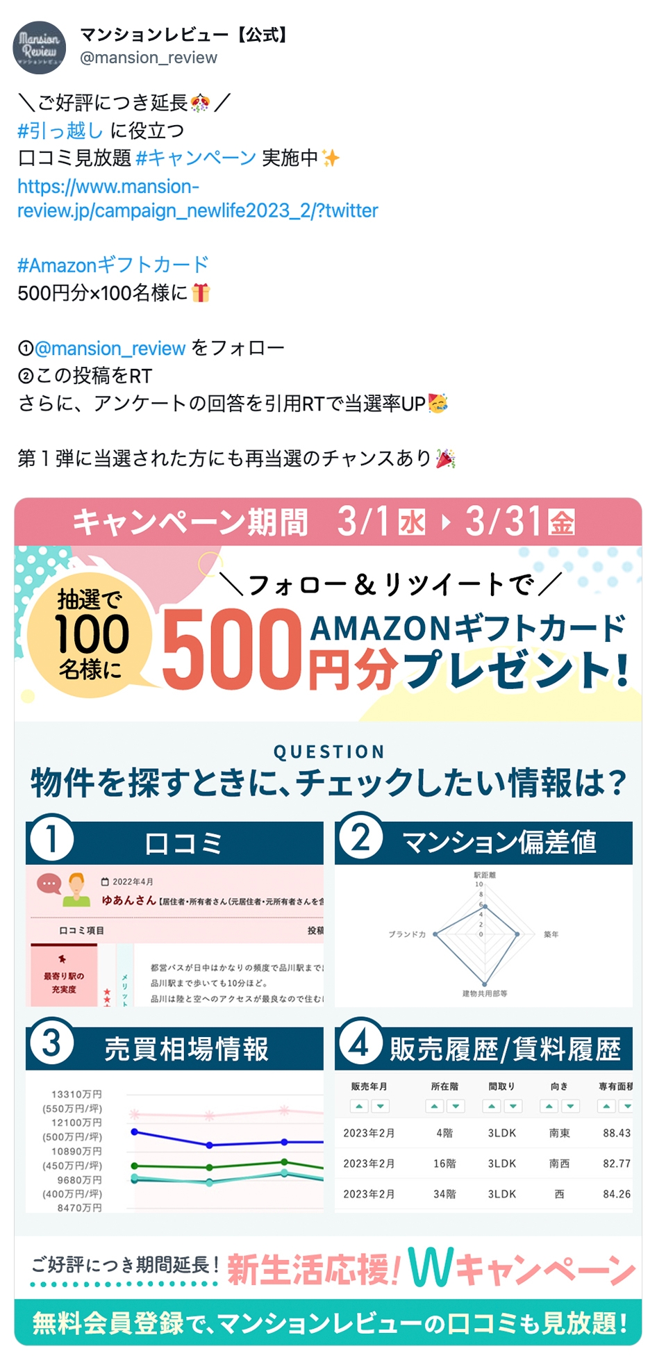 Wキャンペーンの特典としまして、マンションレビューの既存会員様はもちろん、新規で登録された会員様に最大31日間、口コミが見放題になります。そして、マンションレビュー公式Twitterのキャンペーンツイートをリツイート(以下RT)、または引用リツイート(以下引用RT)で、Amazonギフトカード500円分を抽選で100名様にプレゼント。