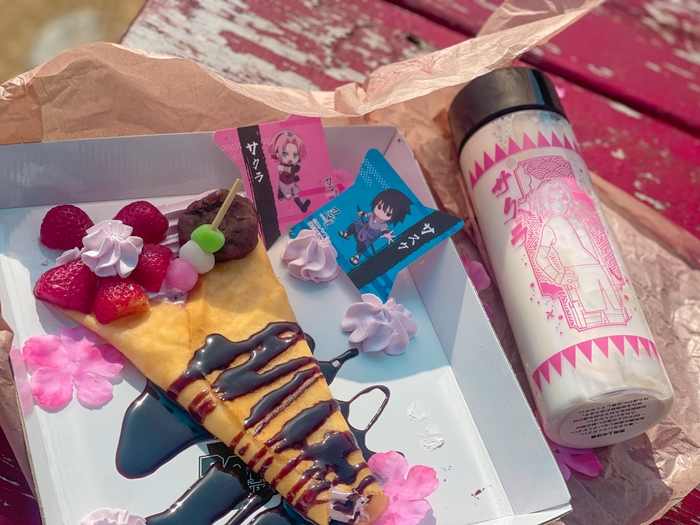 サクラのあんみつクレープとサクラがデザインされたキャラクターボトル(ドリンク入り)に、サクラとサスケのコースターが付いた限定セットを2,188円(税込)にて提供いたします。
