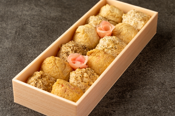 創業家に代々伝わる塩ベースの煮汁で煮込んだ油揚げを商品化した福寿家秘伝のいなり寿司。お揚げの中にはたけのこの酢漬けと茶豆を混ぜた酢飯、鯛やしょうがの入った炊き込みご飯の2種類を包み込んでおり、さっぱりと召し上がっていただけます。醤油や砂糖を使用した煮汁とは異なり、塩ベースの煮汁を使用しているため「見た目が白い」点も特徴です。福寿家でしか味わうことのできない特別ないなり寿司を是非ご賞味ください。