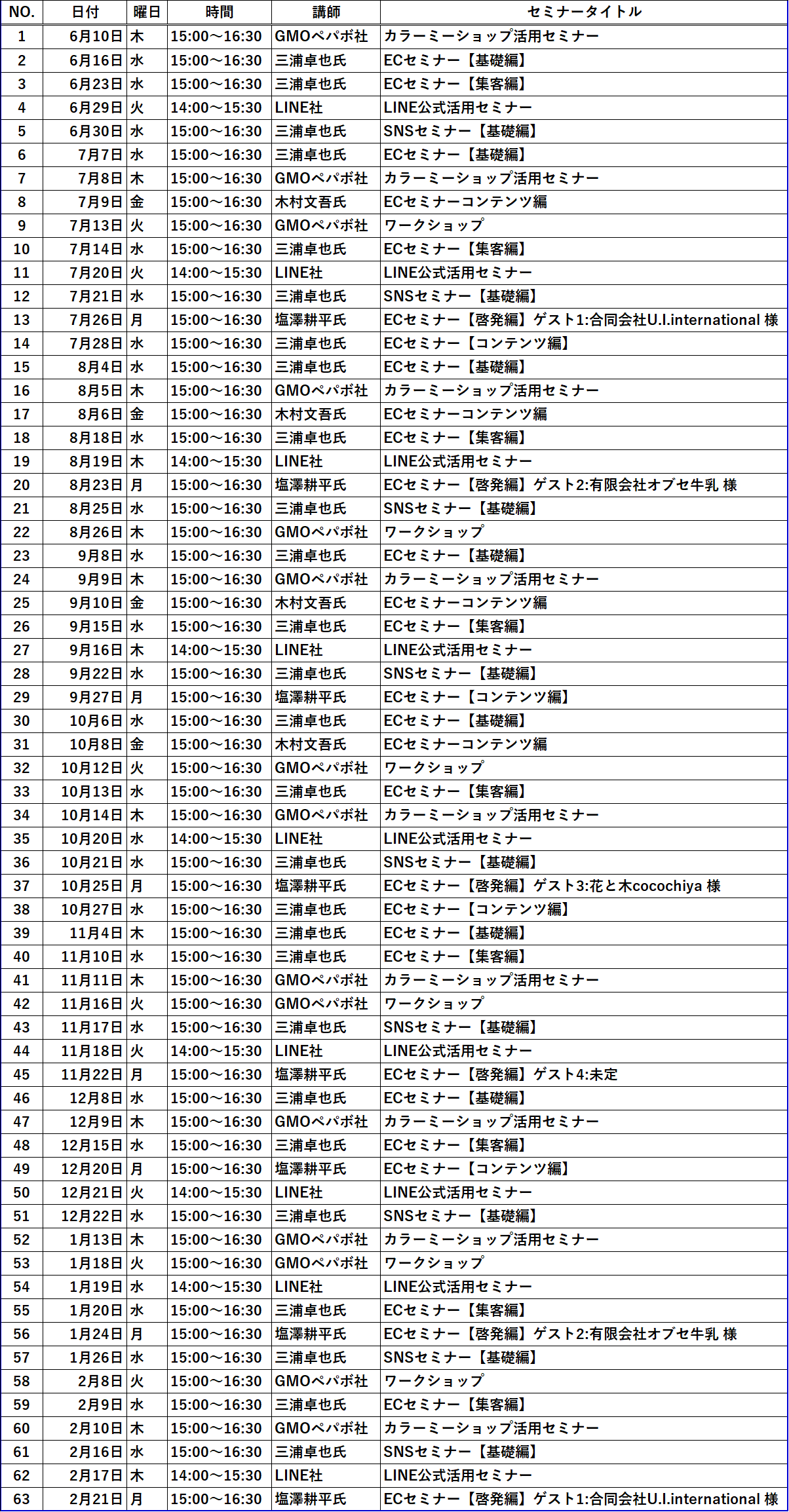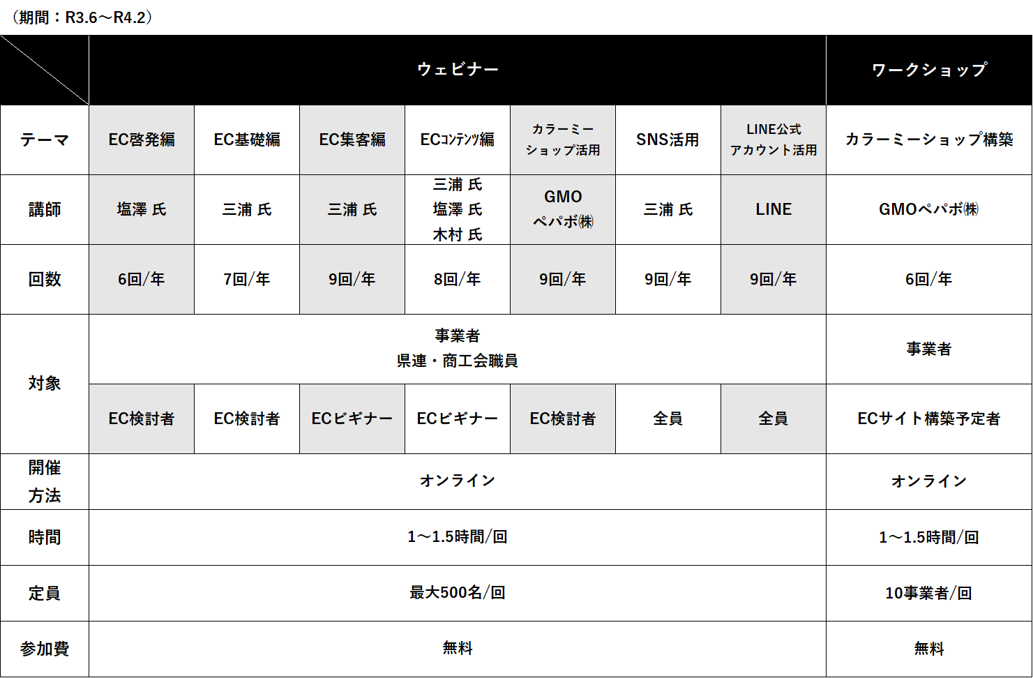 全国連では、そのような課題を解決するため、ECに関する各種セミナーやワークショップを実施することといたしました(全63回)。実際にECを活用している中小・小規模事業者にも講師として参加いただき、EC化の必要性を同じ事業者の立場から伝えていただきます。知識の習得からEC立ち上げ、ブランディングや集客、SNSとの連携など、ECを活用して販路を拡大させ、売上を増加させるために必要なセミナーもご準備しています。セミナー・ワークショップはすべてオンライン開催となりますが、チャットで質問を行うことができ、その質問に対し講師が回答いたします。