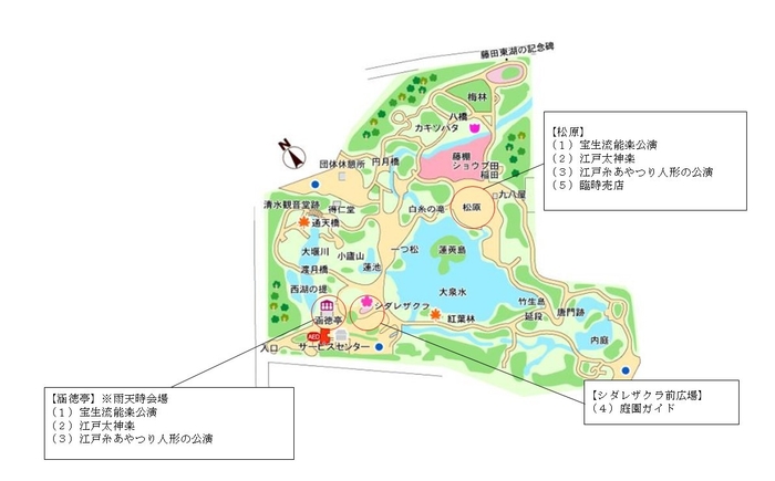 ※雨天の場合のみ、涵徳亭(定員70人)にて実施のため、当日先着順となります。(各回開始20分前より受付)