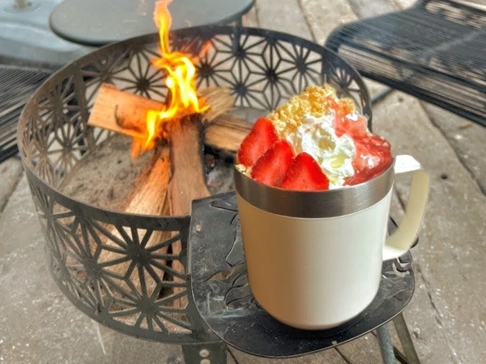 生いちごスライスといちごチョコを使った豪華なスモアとお好きなドリンクのセット。たき火を使って自分好みのスモアスイーツを作って楽しめます!