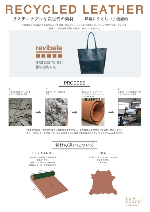 リサイクルレザーは、本革の生産工程に比べて水の使用量や二酸化炭素排出量を抑えることができるので環境にも優しく、貴重な動物の革を無駄なく使用することもできる、とてもエコな素材です。