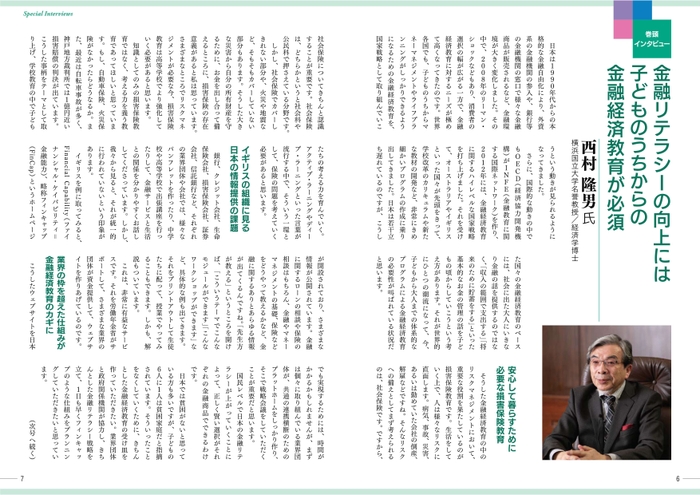 本誌では、文部科学省初等中等教育局教育課程課の教科調査官、横浜国立大学名誉教授の西村 隆男氏等の有識者による金融経済教育や損害保険教育の必要性に関するメッセージの他、当協会の教材を実際に活用いただいた先生の声や、当協会の事業等を紹介しています。
