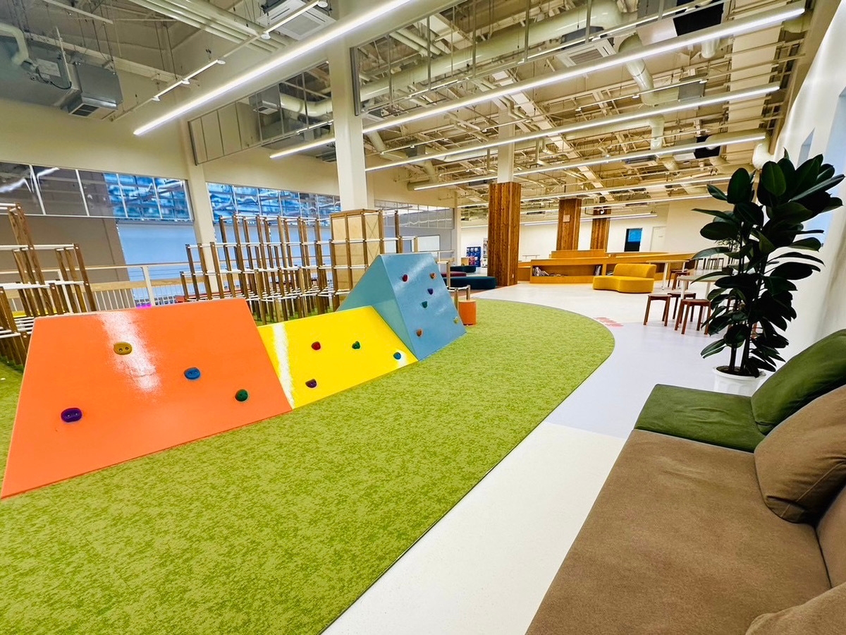 直売所2階の屋内交流スペースは、緊急時の指定避難場所として作られた場所で、普段は無料のフリースペース、キッズスペースとして活用しており、読書コーナーやジャングルジムを設置したことにより、毎日たくさんのお子様だけでなくゆっくり過ごしたい方にも利用されています。無料で楽しめるミニゲームコーナーもあり、靴を脱いでご利用いただく休息スペースでは、まだ歩けない小さなお子様でも利用しやすい施設になっています。近くには、キッズトイレやキッズケアスペースを設置し、その付近と24時間トイレ付近にベビーケア用品専用の自動販売機を2台設置しています。