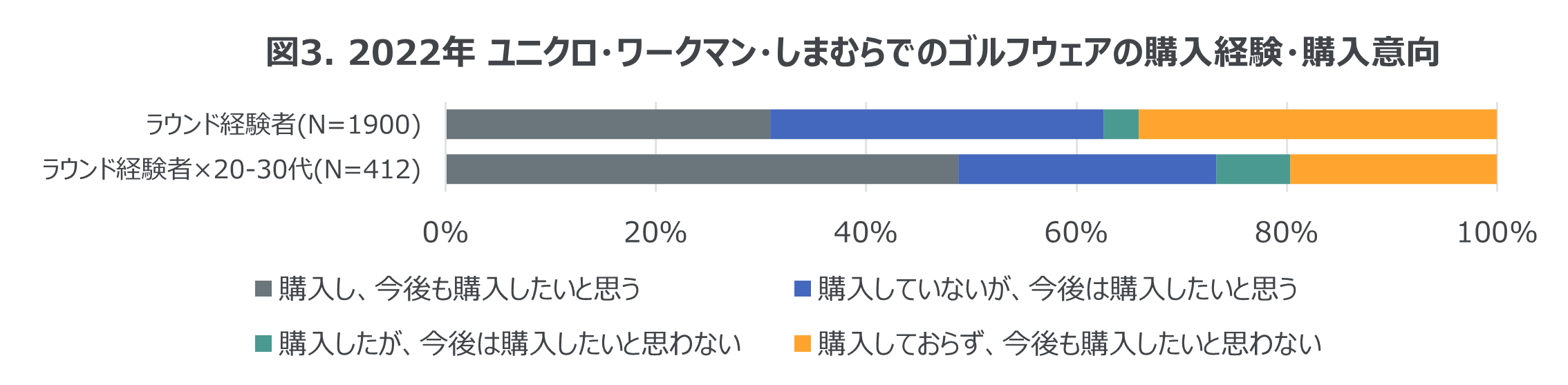 ・2022年のユニクロ・ワークマン・しまむらでの購入経験者は全体の約3割。20-30代は5割以上。