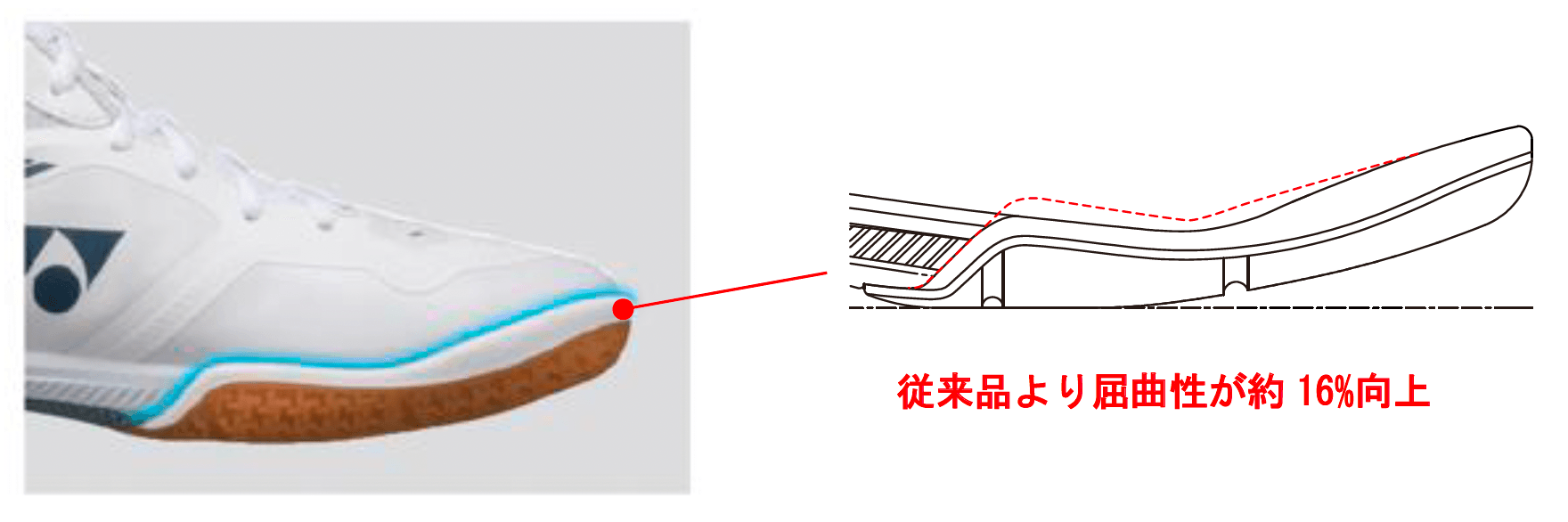 つま先部内側のアウトソールラバーの巻き上げを最適化することで屈曲性が向上。動き出しやすく、ダッシュ力を高めます。