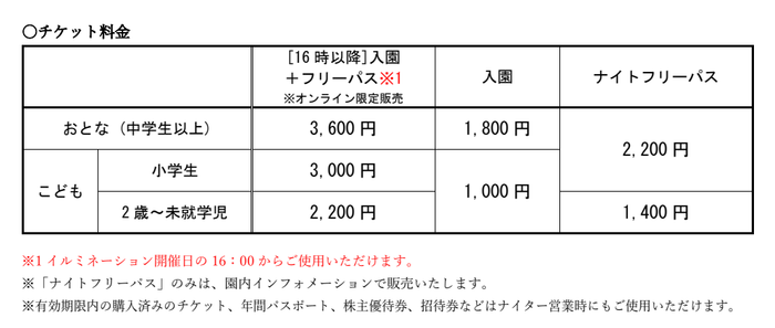 イルミネーションエリア観覧およびナイトアトラクションの一部を体験が可能です。