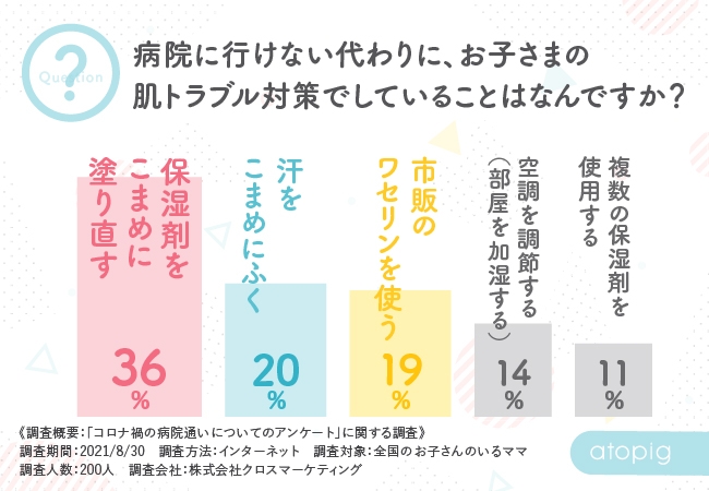 「病院に行けない代わりに、お子さまの肌トラブル対策でしていることはなんですか?」の質問に対して、『保湿剤をこまめに塗り直す(36%)』『汗をこまめにふく(20%)』『市販のワセリンを使う(19%)』『空調を調節する(14%)』『複数の保湿剤を使用する(11%)』という結果に。