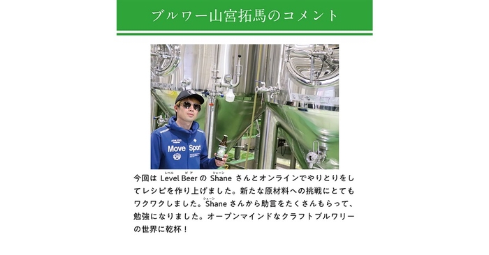 今回のコラボレーションではLEVEL BEERのShaneさんとメールでやりとりをして、レシピを作り上げました。新たな原材料への挑戦でとてもワクワクしましたし、助言をたくさんもらって勉強になりました。オープンマインドなクラフトブルワリーの世界に乾杯!!